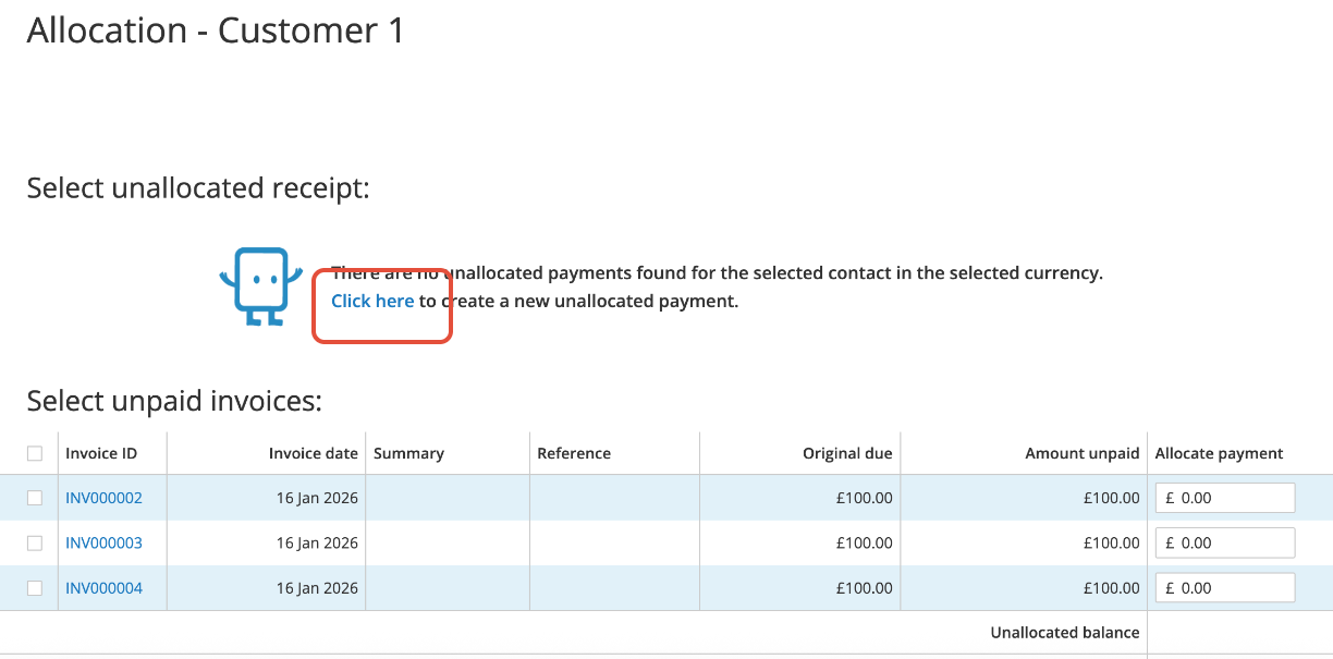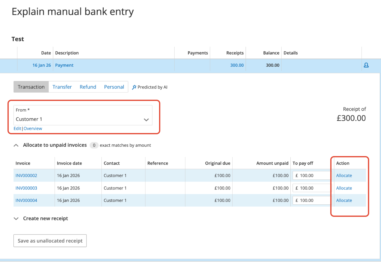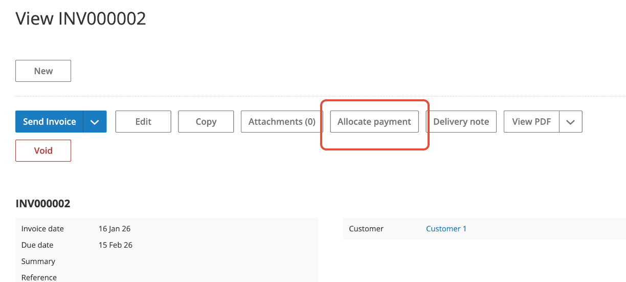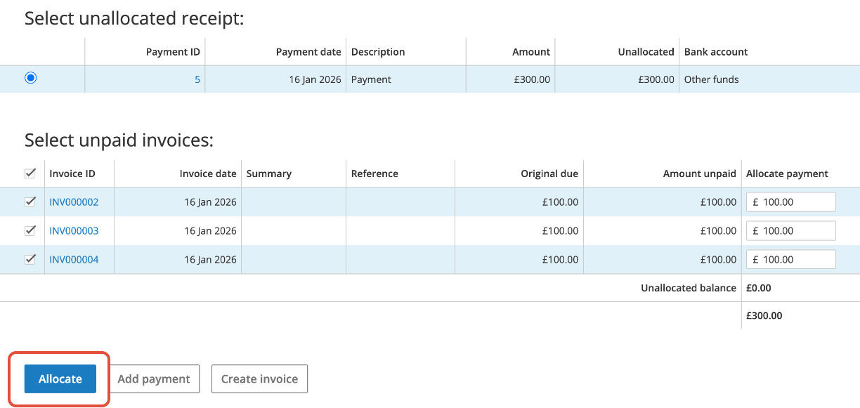 - Click Allocate next to the relevant invoice(s). You can split the payment across multiple invoices if needed.