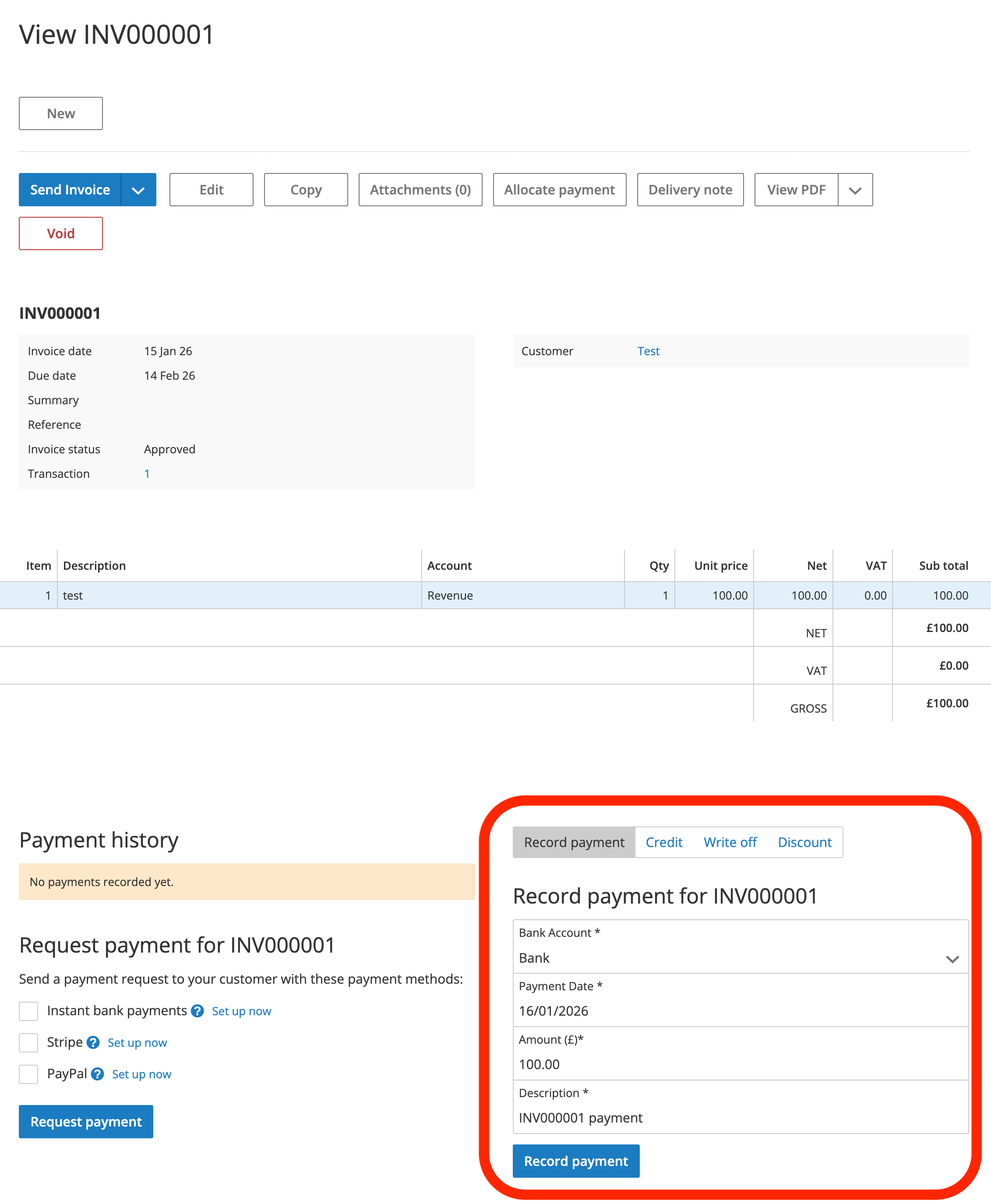 Paid plans have a streamlined feature that allows you to record payments directly on the invoice view.