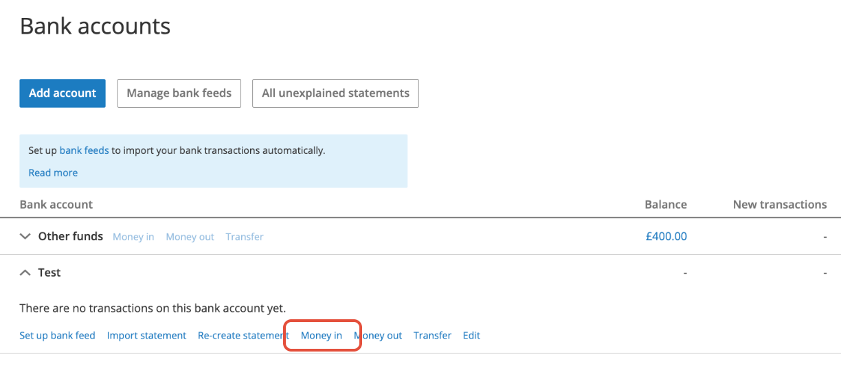 - Find your bank account and click the Money in link. (You may need to click the down arrow to expand the options).