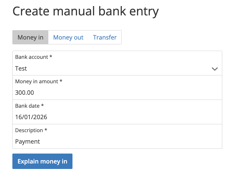 - Enter the Amount, Date, and Description of the receipt, then click "Explain Money in".